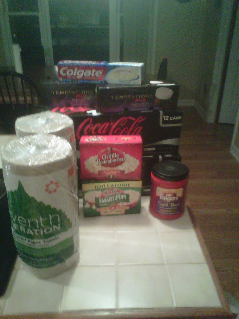 Orville Redenbacher & cokes (I had an $1.50 off 2 Orville e-vic coupon and a $1.50 off Coke AND popcorn coupon (this was a tear pad))